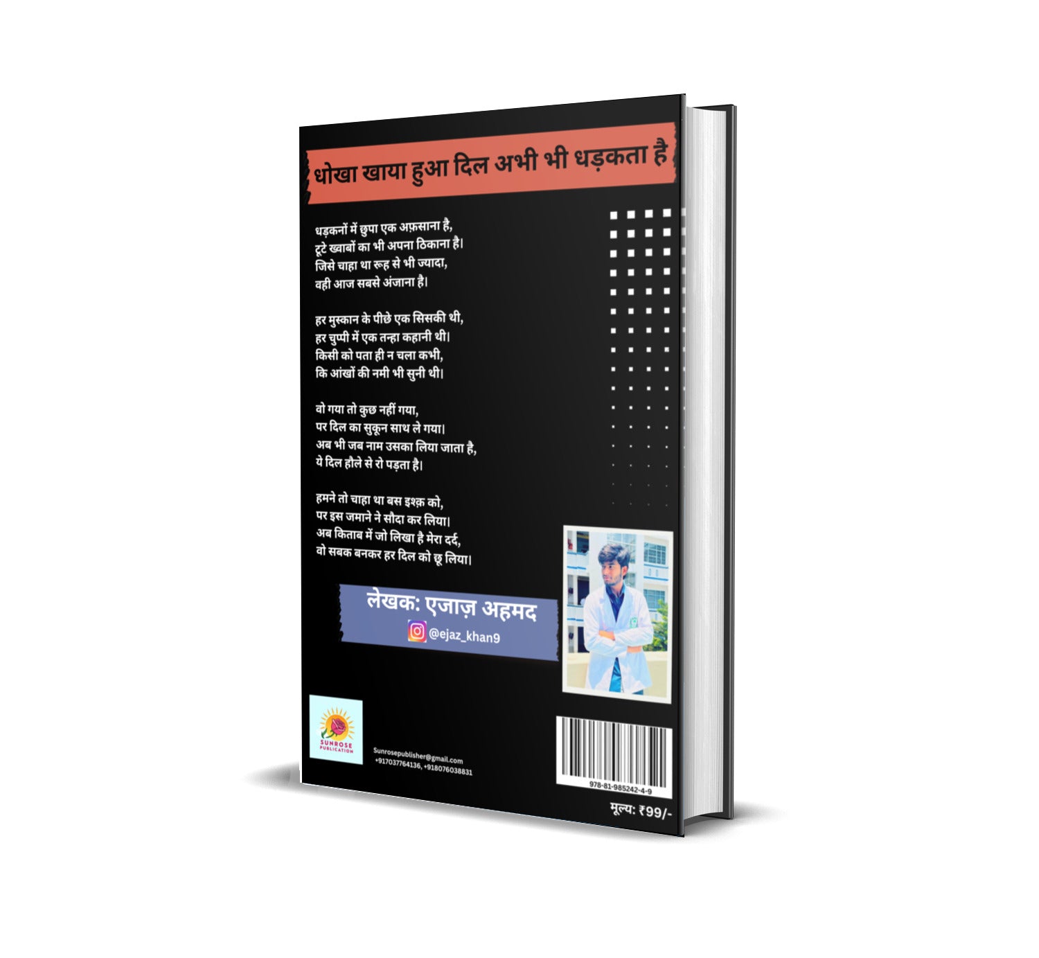"धोखा खाया हुआ दिल अभी भी धड़कता है" एक ऐसी किताब है, जो उन जज़्बातों को बयान करती है जिन्हें अक्सर लोग दिल में दबा लेते हैं। ये किताब सिर्फ़ मोहब्बत नहीं, बल्कि मोहब्बत के बाद बचे हुए खालीपन की कहानी है। जब रिश्ता टूटता है, तो सिर्फ़ साथ नहीं छूटता... टूटती है उम्मीदें, बिखरते हैं ख्वाब और अंदर ही अंदर एक इंसान बदल जाता है। इस किताब में आप पाएंगे शायरी, एहसास, और एक अधूरी मोहब्बत की मुकम्मल तस्वीर। अगर आपने कभी सच्चा प्यार किया है, धोखा खाया है, या फिर जुदाई को महसूस किया है — तो ये किताब आपकी अपनी लगेगी। लेखक Ejaz Ahmad ने इस किताब के हर शब्द में अपना दिल उंडेल दिया है। पढ़िए, महसूस कीजिए और शायद... खुद को थोड़ा और समझ पाईए।