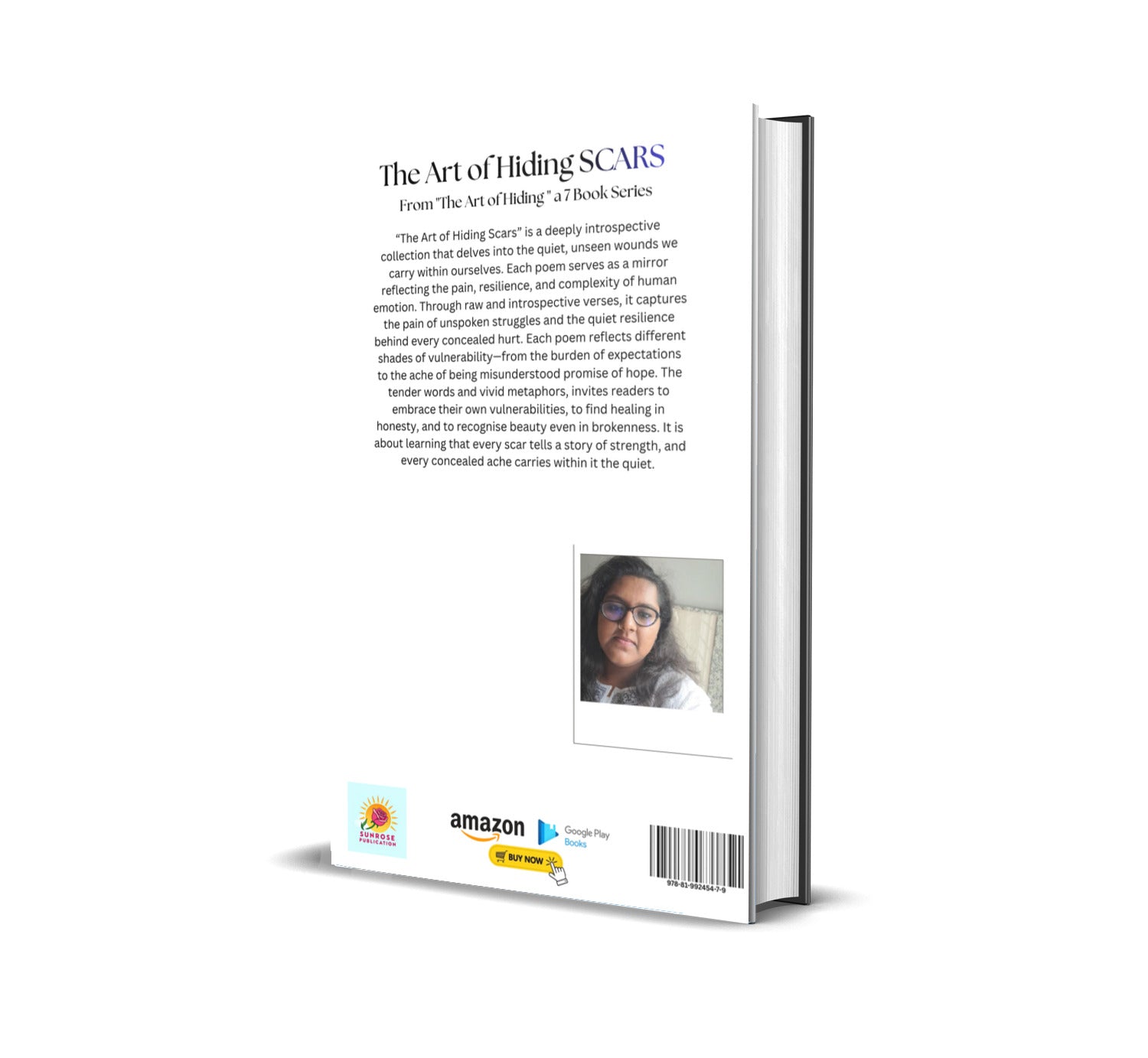 “The Art of Hiding Scars” is a deeply introspective collection that delves into the quiet, unseen wounds we carry within ourselves. Each poem serves as a mirror reflecting the pain, resilience, and complexity of human emotion. Through raw and introspective verses, it captures the pain of unspoken struggles and the quiet resilience behind every concealed hurt. Each poem reflects different shades of vulnerability—from the burden of expectations to the ache of being misunderstood promise of hope. The tender words and vivid metaphors, invites readers to embrace their own vulnerabilities, to find healing in honesty, and to recognise beauty even in brokenness. It is about learning that every scar tells a story of strength, and every concealed ache carries within it the quiet.
